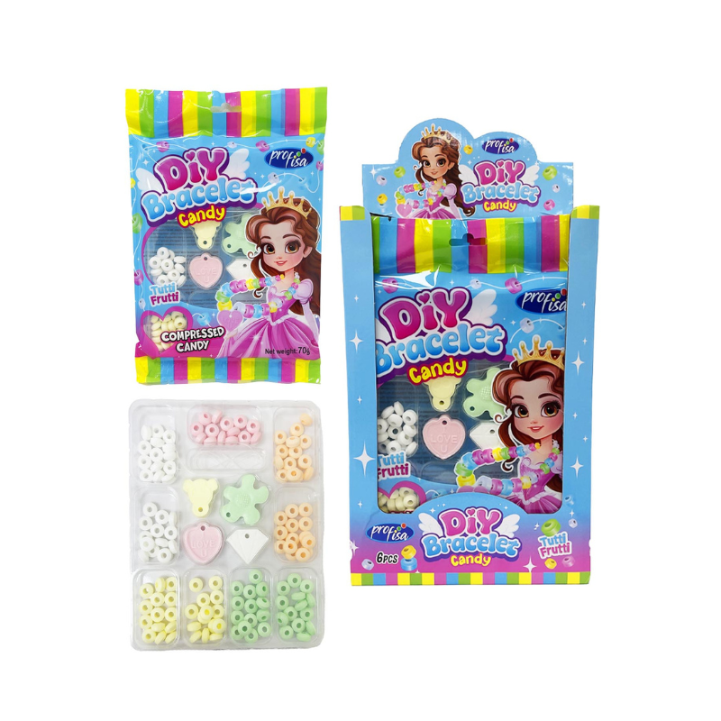¡Dulce, divertida y mágica! ✨ La DIY Pulsera de Chuches Princesa es ideal para crear tus propias joyas comestibles. Forma pulseras, colgantes y más con estas chuches de colores sabor tutti frutti 🍬. ¡Perfecta para jugar y saborear!