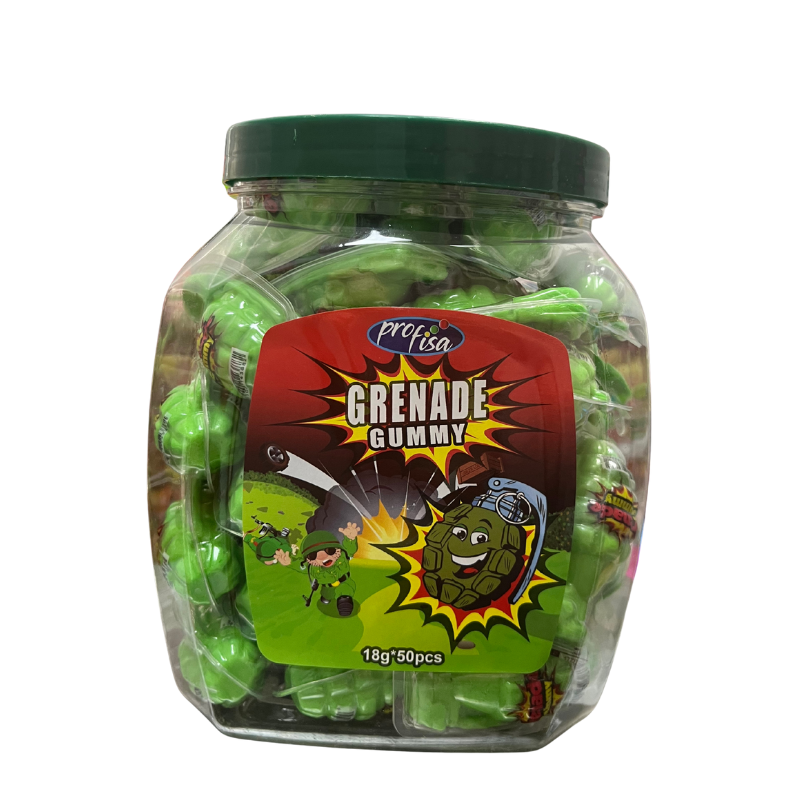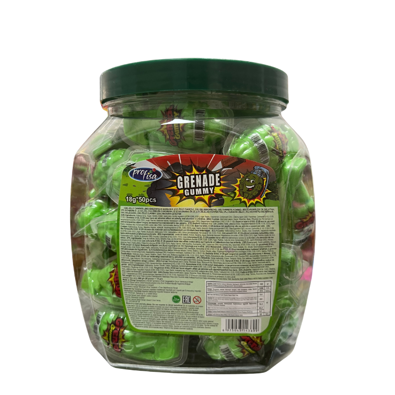 ¡Explosión de sabor en cada bocado! Las Granadas Rellenas Profisa son gominolas con forma de granada militar, con exterior blando y un interior líquido súper intenso y ácido.