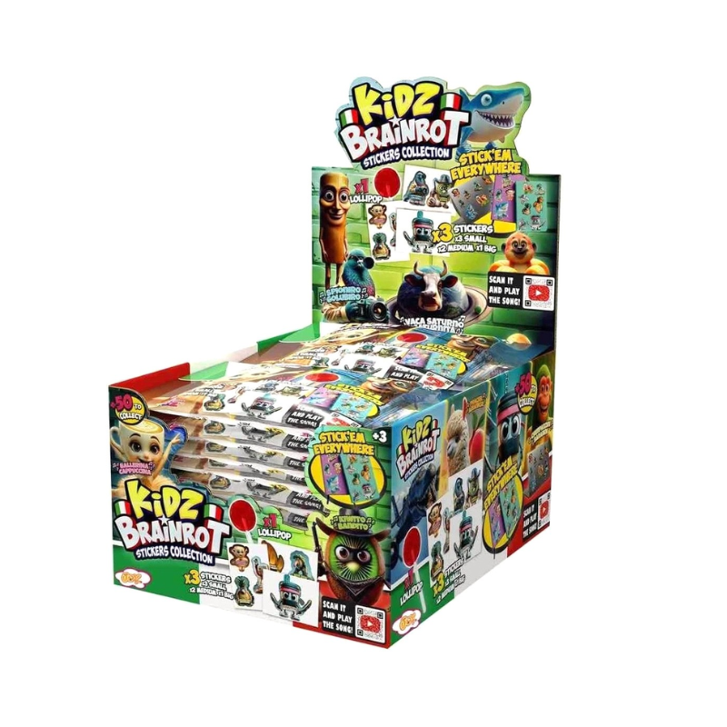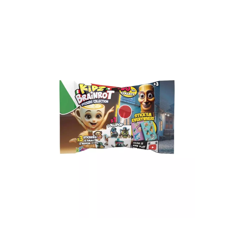 ¡Descubre la colección más divertida del momento! Cada sobre de Kidz Brainrot incluye 3 pegatinas exclusivas y una deliciosa piruleta. Más de 50 personajes distintos para coleccionar, pegar y compartir. Un mix perfecto de sabor y diversión.