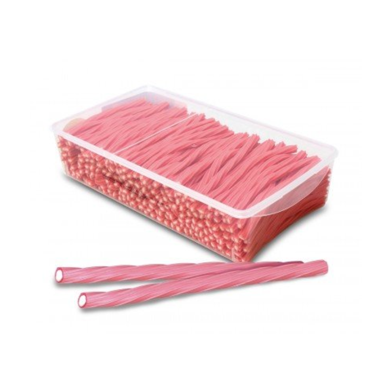 Disfruta del sabor dulce y cremoso de estas irresistibles Torcida Rellena Helado Fresa Nata de Fini. Con un exterior suave de regaliz rosa y un relleno delicioso con sabor a helado de fresa y nata, son ideales para tiendas, celebraciones, eventos o para disfrutar en casa.